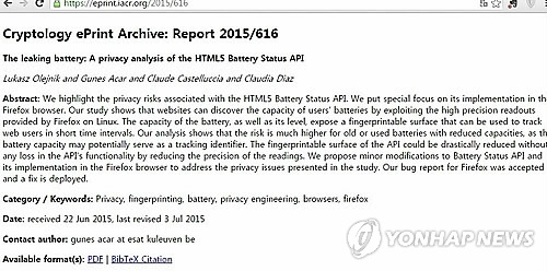 | △ 휴대전화의 배터리상태 알림 소프트웨어가 휴대전화 이용자의 신원과 인터넷 활동을 추적하는데 이용될 수 있다는 논문. |