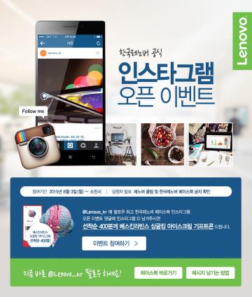 한국레노버는 인스타그램 공식 오픈을 기념해 지난 3일부터 선착순 400명에게 배스킨라빈스 기프트콘을 증정하는 이벤트를 진행하고 있다. 한국레노버 공식 인스타그램 계정을 팔로우하고 페이스북 페이지에 댓글로 인스타그램 아이디를 등록하면 자동으로 응모된다.