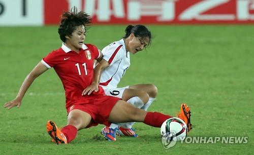 | △ 볼다툼 벌이는 북한-중국 (우한<중국>=연합뉴스) 최재구 기자 = 4일 중국 후베이성 우한스포츠센터에서 열린 동아시안컵 여자축구대회 북한과 중국의 경기에서 양팀 선수들이 볼다툼을 벌이고 있다. 2015.8.4 jjaeck9@yna.co.kr |
