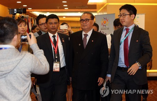 | △ 회의장에 모습 드러낸 리수용 (쿠알라룸푸르=연합뉴스) 박동주 기자 = 리수용 북한 외무상이 5일 아세안지역안보포럼(ARF) 등 아세안(ASEAN) 관련 회의가 열리는 말레이시아 쿠알라룸푸르 푸트라세계무역센터(PWTC)에서 양자회담을 위해 이동하고 있다. |