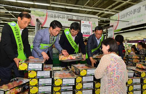 오는 7일부터 내달 초순까지 수도권 하나로마트 주요 매장에서 우박피해 농가에서 생산한 사과와 복숭아를 정상가보다 50% 할인한 가격에 판다.