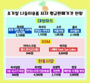 기업형슈퍼(SSM)는 아이스크림 롯데제과 월드콘XQ가 946원, 썬크림 니베아 프레시 썬로션이 8천694원으로 대형마트나 전통시장보다 좀 더 쌌다.