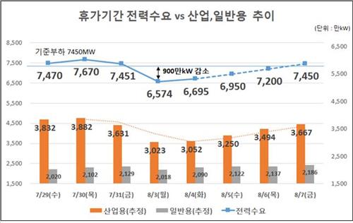 전력거래소는 "일반용은 휴가기간 콘도 및 숙박용 부하증가 등으로 큰 변동이 없는 것으로 나타났다"며 "산업체의 휴가 기간 및 조업률을 파악하고 업종별 부하분석 결과를 전력수요 예측에 활용하고 있다"고 설명했다.
