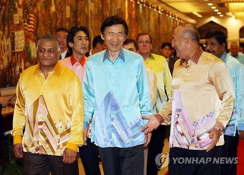 | △ 환영 만찬 참석하는 윤병세 장관 (쿠알라룸푸르=연합뉴스) 박동주 기자 = 윤병세 외교부 장관이 5일 말레이시아 쿠알라룸푸르 푸트라세계무역센터(PWTC)에서 열린 의장국 주최 환영 만찬에 참석하고 있다. |