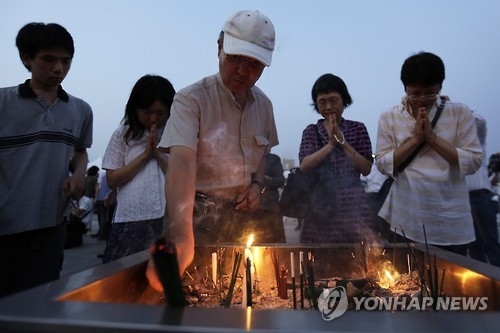 | △ epa04873589 A man (C) lights an incense stick while others offer prayers for victims of the atomic bombing during World War II in 1945, in front of a cenotaph at Hiroshima Peace Memorial Park in Hiroshima, Japan, 06 August 2015. Hiroshima marked the 70th anniversary of the world's first nuclear bombing of the city on 06 August. EPA/KIYOSHI OTA |