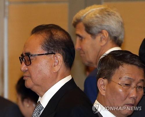 | △ 존 케리 미국 국무장관이 6일 말레이시아 쿠알라룸푸르 푸트라세계무역센터(PWTC)에서 열린 ARF 외교장관회의에 참석하고 있다. 앞쪽은 리수용 북한 외무상. 2015.8.6 |