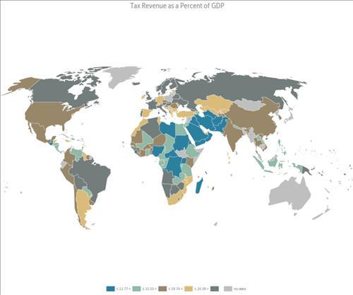 | △ GDP 대비 세수 비율이 11.77% 이하인 경우 청록색. 11.77% 초과 15.55% 이하인 경우 옅은 청색, 15.55% 초과 19.74% 이하인 경우 갈색, 19.74% 초과 24.39% 이하인 경우 옅은 황색, 24.39% 초과는 짙은 회색. 차료 없는 경우는 옅은 회색으로 표시. |