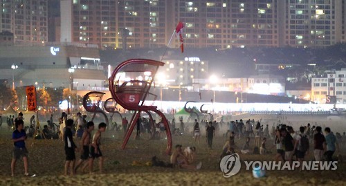 | △ '덥다 더워' 해운대 열대야 (부산=연합뉴스) 조정호 기자 = 부산에 폭염특보가 11일째 계속된 6일 해운대해수욕장 백사장에서 시민이 더위를 식히고 있다. 2015.8.6 ccho@yna.co.kr |