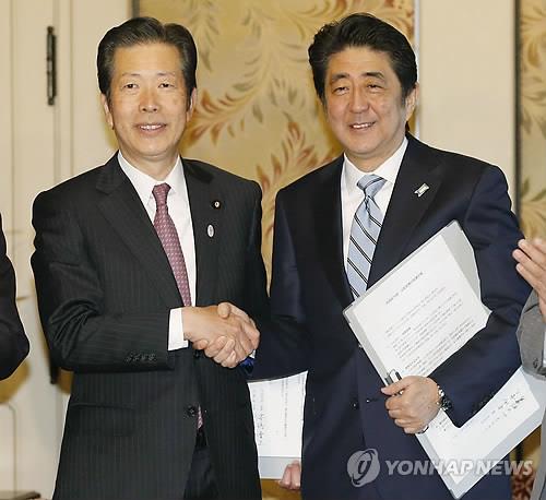 | △ 아베 신조(安倍晋三·오른쪽) 총리와 연립 여당인 공명당의 야마구치 나쓰오(山口那津男) 대표(교도.연합뉴스.자료사진) |