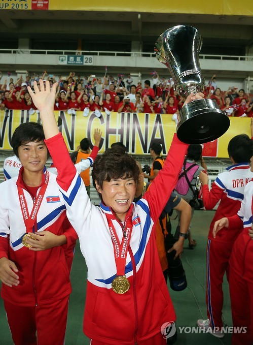 | △ 환호하는 북한여자대표팀 (우한<중국>=연합뉴스) 최재구 기자 = 8일 중국 후베이성 우한 스포츠센터에서 열린 동아시안컵 여자축구대회 시상식에서 우승을 차지한 북한 라은심 선수등이 트로피를 들고 환호하고 있다. 2015.8.9 jjaeck9@yna.co.kr |