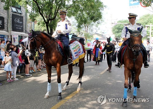 | △ '4대악 근절 풋 퍼레이드' (전주=연합뉴스) 4대악(성·가정·학교폭력, 불량식품) 근절을 위한 '풋 퍼레이드'가 31일 오후 전북 전주시 완산구 한옥마을에서 열리고 있다. 이날 퍼레이드에서는 경찰기마대, 포돌이·포순이, 교통경찰 등과 스파이더맨, 배트맨, 포졸로 변장한 경찰이 4대악 근절 홍보물을 전달하고 관광객들과 기념촬영을 했다. 2015.7.31 doo@yna.co.kr |