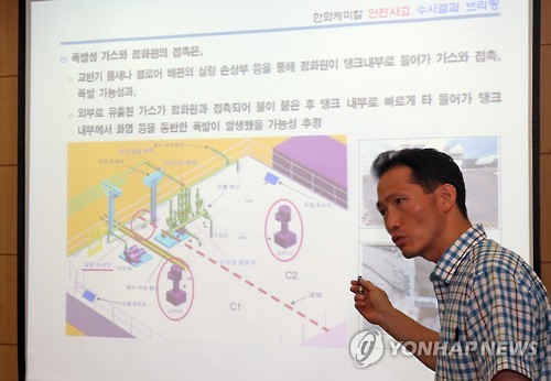 | △ 경찰, 한화케미칼 폭발사고 수사결과 발표 (울산=연합뉴스) 김용태 기자 = 10일 오전 울산 남부경찰서 소회의실에서 방경배 남부서 형사과장이 한화케미칼 울산2공장 폐수 저장조 폭발사고의 수사결과를 발표하고 있다. 경찰은 한화케미칼 울산공장장 유모(50)씨를 포함한 6명에 대해 업무상 과실치사상 등의 혐의로 구속영장을 신청했다. 2015.8.10 yongtae@yna.co.kr |