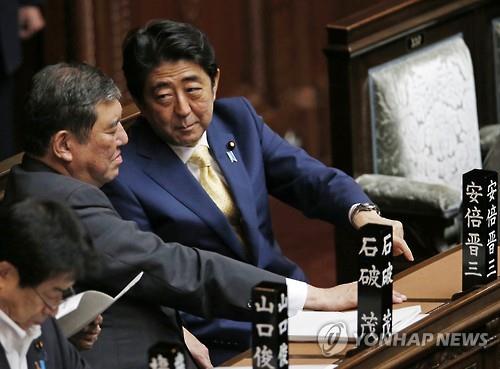 | △ 아베 신조(오른쪽) 일본 총리와 이시바 시게루 지방창생 담당상.(AP=연합뉴스 자료사진) |