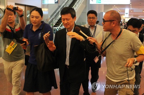 | △ 롯데의 후계구도는…신동주에 쏠린 눈 (도쿄=연합뉴스) 이세원 특파원 = 후계 경영권을 둘러싸고 신동빈 롯데그룹 회장과 대립 중인 신동주 전 일본 롯데홀딩스 부회장이 7일 도쿄(東京) 하네다(羽田)공항으로 일본에 입국했다. 도착 출구로 나온 후 취재진에 둘러싸인 신동주. 2015.8.7 sewonlee@yna.co.kr |