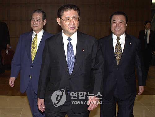 | △ 2001년 자민당 간사장 시절 방한했을 때의 야마사키 다쿠(가운데) |