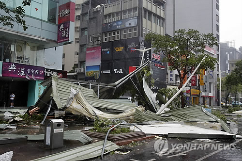 | △ 8일(현지시간) 대만 타이베이 거리에 태풍 '사우델로르'(Soudelor)의 강풍에 건물 옥상과 간판 등이 떨어져 어지럽게 널려 있다. (AP=연합뉴스) |
