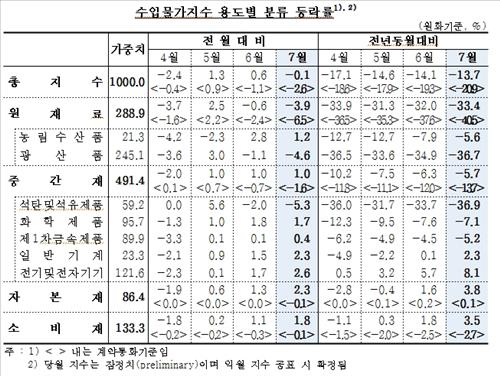 7월 수입물가지수는 81.97로 전달보다 0.1%, 작년 같은 달보다는 13.7% 내렸다.