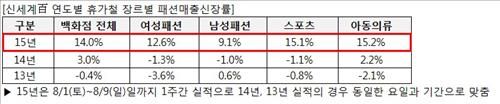 휴가철을 앞두고 원피스 또는 반바지 등 휴가지에서 입을 옷을 백화점에서 구매하는 고객이 늘어났다는 것이다.
