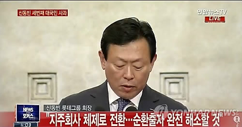 (서울=연합뉴스) 이유미 기자 = 롯데그룹 신동빈 회장은 11일 오전 서울 소공동 롯데호텔에서 대국민 사과문을 발표하고 한국 롯데의 지주사인 호텔롯데의 기업공개를 추진겠다는 뜻을 밝혔다.