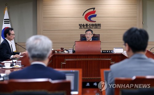 | △ 방통위 전체회의 (과천=연합뉴스) 신준희 기자 = 최성준 방송통신위원장이 6일 오전 정부과천청사 방송통신위원회에서 열린 전체회의를 주재하고 있다. 방통위는 이날 KBS 후임 이사 추천에 관한 건을 논의할 예정이었으나 오는 7일로 미뤘다. 2015.8.6 hama@yna.co.kr |