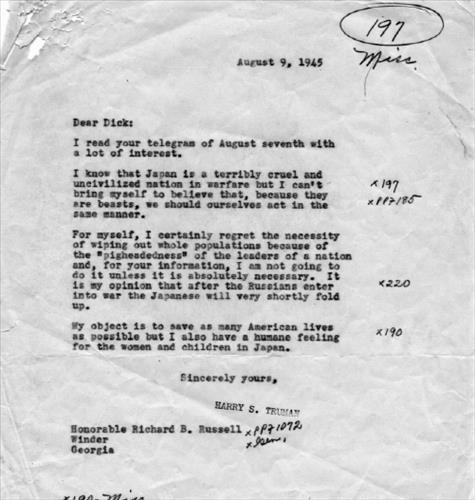 트루먼은 또 서한 모두에서 "나는 일본이 극도로 잔인하고 야만적인 전쟁국가라는 것을 안다"며 "그러나 그들이 짐승이라고 우리도 같은 방식으로 행동해야 한다는 점을 내 자신에게 납득시킬 수 없다"고도 했다.