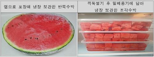 (서울=연합뉴스) 오예진 기자 = 먹고 남은 수박을 냉장보관 할 때 랩이나 비닐에 싸기보다 작게 잘라 밀폐용기에 보관하는 것이 식중독 예방에 도움이 된다는 실험 결과가 나왔다.
