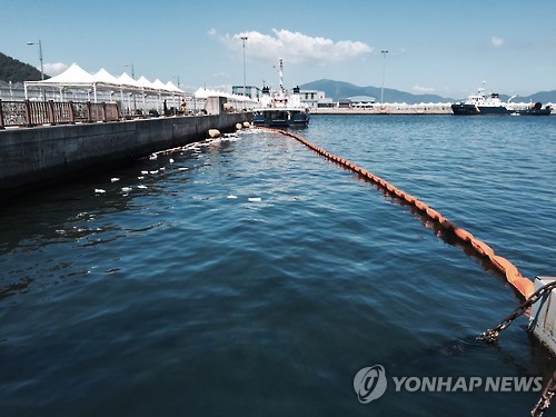 | △ 지난달 26일 전남 여수시 덕충동 여수신항 크루즈부두 앞 해상에서 중질유로 추정되는 기름이 유출돼 여수시와 해경 등이 방제작업을 펼치고 있다. (연합뉴스 자료사진) |