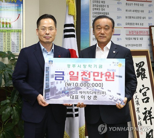 | △ '기부가 천직입니다' (경주=연합뉴스) 경주의 자동차 부품업체인 에이치디에스 이상춘 대표이사(왼쪽)가 최양식 경주시장에게 장학금을 전달하고 있다. 경북 1호 아너소사이어티 회원인 이씨는 매년 지역의 어려운 이웃을 위해 기부와 선행을 하면서 나눔경영을 실천하고 있다. 2015.8.11 << 경주시 >> shlim@yna.co.kr |