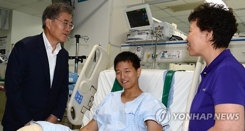 | △ 지뢰폭발 부상장병 위문하는 문재인 대표 (성남 국회 사진기자단=연합뉴스) 새정치민주연합 문재인 대표가 11일 오후 경기도 성남시 국군수도병원 중환자실을 찾아 비무장지대(DMZ)내에서 북한이 설치한 것으로 추정되는 목함지뢰 폭발로 부상한 김정원 하사를 위로 방문하고 있다. 2015.8.11 photo@yna.co.kr |