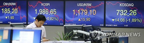 | △ 위안화 평가 절하, 원화 통화 급락 (서울=연합뉴스) 황광모 기자 = 11일 오후 서울 명동 외환은행 본점 딜링룸에 이날 증시 종가와 원·달러 환율, 원 ·위엔화 환율이 표시 돼 있다. 중국의 위안화 평가절하 조처에 한국을 포함한 아시아 주요국 통화 가치가 일제히 급락세를 나타냈다. 코스피는 전날대비 0.82& 하락한 1,986.65를 기록했으며 코스닥 지수는 1.89% 떨어진 732.26을 기록했다. |