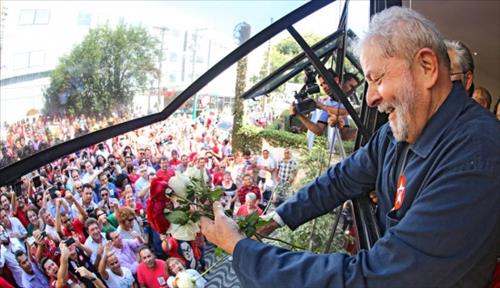 | △ 룰라 전 대통령이 자신의 이름을 딴 '룰라 연구소' 앞에 모인 지지자들에게 꽃을 던지고 있다.(출처:룰라 연구소) |