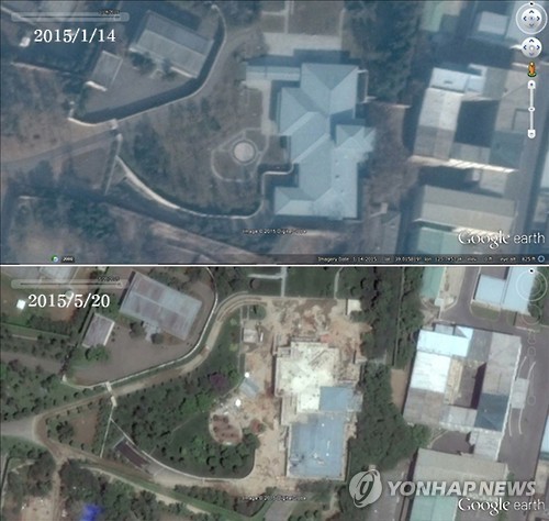 | △ 북한, 김정은 호화 15호 관저 부수고 또 재건축 (서울 구글=연합뉴스) 북한이 수백억 원이 들어간 것으로 보이는 김정은 국방위원회 제1위원장의 집무공간인 15호 관저 일부를 허물고 새롭게 짓고 있는 사실이 확인됐다. 지난 1월 14일(위)과 5월 20일(아래) 미국 상업위성의 위성사진을 비교해보면 북한이 15호 관저의 북쪽 일부를 철거한 뒤 신축공사에 나서고 있음이 확인된다. 관저 앞 정원에 대한 조경공사가 한창인 모습도 보인다. 2015.8.12 <위 사진 크레디트는 (구글/연합뉴스)로 표기해야 하며 뉴스보도 목적으로만 사용가능(판매금지) 합니다.> nkphoto@yna.co.kr |