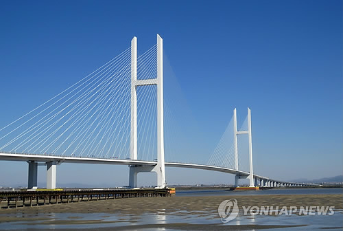 | △ 완공 임박한 북한-중국 신압록강대교 (단둥=연합뉴스) 신민재 특파원 = 완공을 눈 앞에 둔 북한 신의주와 중국 단둥을 연결하는 신압록강대교의 모습. 2014.10.16 <<국제뉴스부 기사 참조>> smj@yna.co.kr |