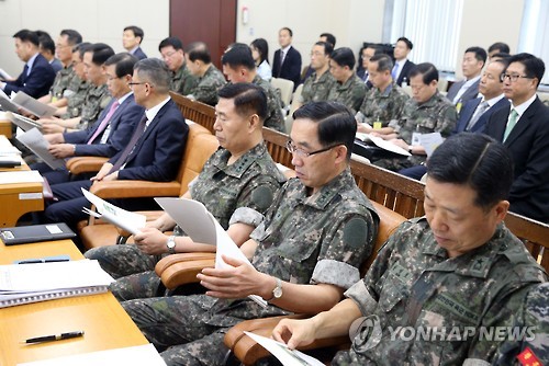 | △ 국방위원회의 각군 수뇌부 (서울=연합뉴스) 도광환 기자 = 12일 오전 국회에서 열린 국방위원회에서 각 군 수뇌부들이 회의에 참석해 있다. |