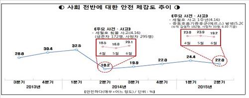 그러나 메르스 사태와 세월호 1주년 등이 겹치며 올해 2분기 조사 때는 '안전하다'는 응답률이 22.0%로 다시 하락했다.