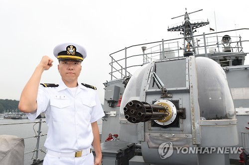 | △ 김좌진 장군 증손자 김도현 소위 (서울=연합뉴스) 김좌진 장군의 증손자인 김도현(29) 소위가 자신이 근무할 옹진함에 올라 포즈를 취한 모습. |