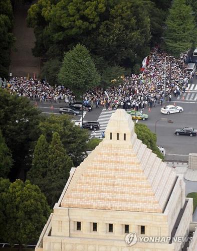 | △ 일본 국회의사당과 주변에 모인 안보법안 반대 시위대(교도=연합뉴스 자료사진) |