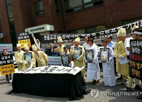 이들은 "교육부는 일본식 한자혼용 주장자들 말만 듣고, 그것도 광복 70주년에 한자 병기 정책을 추진하고 있다"며 "신문과 대학 논문도 한글로만 쓰는 세상에 어처구니없는 일이 일어났다"고 지적했다.