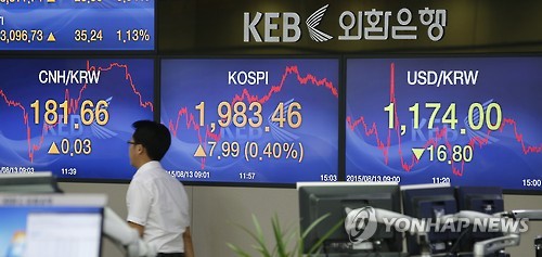 | △ '위안화 충격' 완화 (서울=연합뉴스) 황광모 기자 = 중국의 위안화 평가절하가 사흘째 이어진 13일 오후 서울 명동 외환은행 딜링룸 전광판. 이날 코스피는 13일 사흘 연속 이어진 위안화 평가절하 충격을 딛고 반등에 성공해 7.99포인트(0.40%) 오른 1,983.46으로 마감했다. |