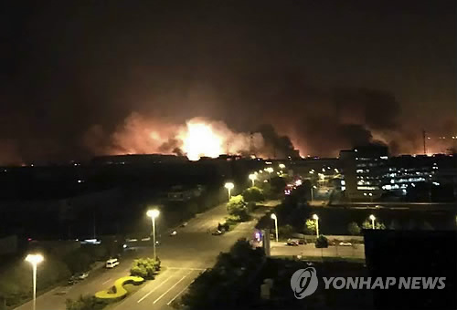 | △ 텐진항서 대형 폭발 (텐진 AP/신화=연합뉴스) 대형 폭발사고가 발생한 중국 동북부 톈진(天津)항 쪽에서 13일(현지시간) 연기와 함께 화염이 치솟고 있는 모습. |
