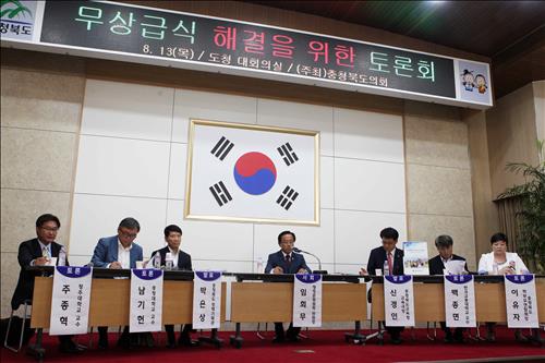 | △ (청주=연합뉴스) 전창해 기자 = 충북도의회는 12일 도청 대회의실에서 도와 도교육청 관계자, 양 기관이 추천한 외부 전문가 등이 참여한 가운데 '무상급식 해결을 위한 토론회'를 했다. 2015.8.13 |
