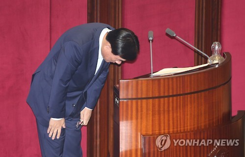 | △ 사죄의 절하는 박기춘 의원 (서울=연합뉴스) 도광환 기자 = 무소속 박기춘 의원이 13일 오후 열린 국회 본회의에 참석, 체포동의안 투표에 앞서 가진 신상발언을 마친 뒤 고개숙여 절하고 있다. |