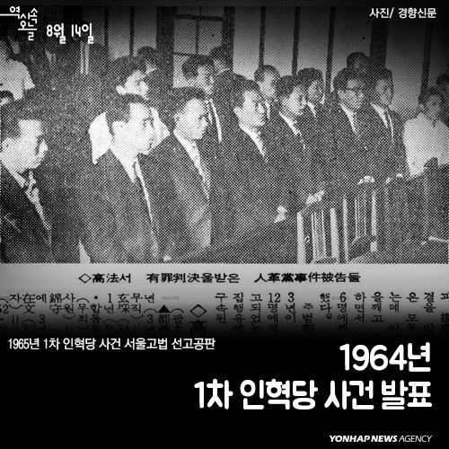 (서울=연합뉴스) 1964년 8월14일 김형욱(1925∼1984) 중앙정보부장이 '인민혁명당(인혁당) 사건' 수사 결과를 발표했다. '북한 노동당의 지령을 받고 국가 변란을 기획한 인혁당 사건을 적발해 일당 57명 중 41명을 구속하고 16명을 수배 중'이라는 게 발표의 요지. '사법 살인'으로 이어진 인혁당 사건의 서막이었다.
