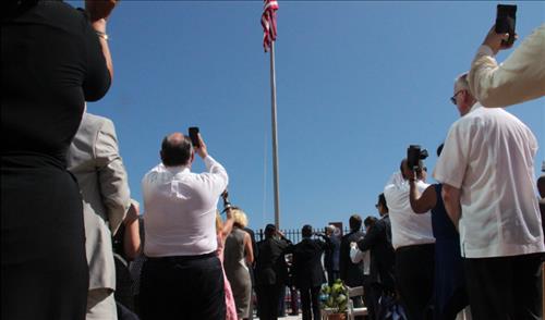 성조기는 1961년 1월 3일 양국의 외교관계 단절 직후 성조기를 하강했던 짐 트레이스(78) 당시 미 해병대 원사와 마이크 이스트(76) 하사, 래리 모리스(75) 상병이 같은 자리에 나와 다시 게양식을 가졌다. 다만 이들 세명은 고령인 탓에 현역 해병대원 3명에게 새로운 성조기를 건네 대신 게양토록 한 뒤 경례를 붙였다.