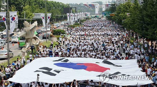 | △ 광복 70주년, 대형 태극기 전달 퍼포먼스 (서울=연합뉴스) 홍해인 기자 = 15일 오후 서울 올림픽로 송파구청 사거리-올림픽공원 평화의문 광장 구간에서 열린 '춤 815' 플래시몹 행사에서 2천여명의 참가자들이 편도 4차선 도로 폭의 대형 태극기를 머리 위로 전달하는 퍼포먼스를 선보이고 있다. 2015.8.15 hihong@yna.co.kr |