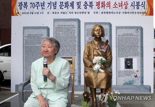 | △ 청주 방문한 위안부 피해자 길원옥 할머니 (청주=연합뉴스) 김형우 기자 = 광복절인 15일 오전 청주시 청소년과장 인근에 임시설치된 충북 평화의 소녀상 시봉식에 참석한 위안부 피해자 길원옥(87) 할머니가 참석자들에게 이야기하고 있다. 2015.8.15 vodcast@yna.co.kr |