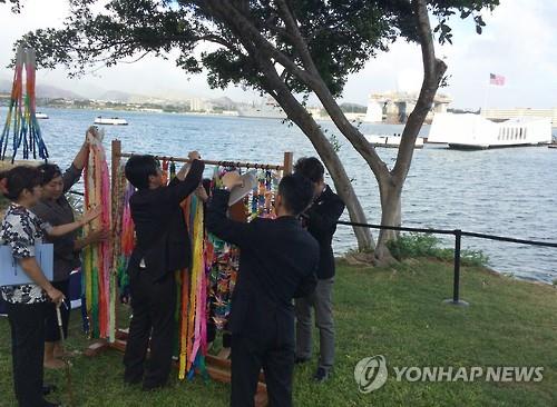 (하와이 AP=연합뉴스) 미국과 일본의 우호도시가 14일(현지시간) 제2차 세계대전의 종전 70주년을 맞아 미국 하와이주 진주만에서 열린 미국 해군의 기념식을 함께 했다.