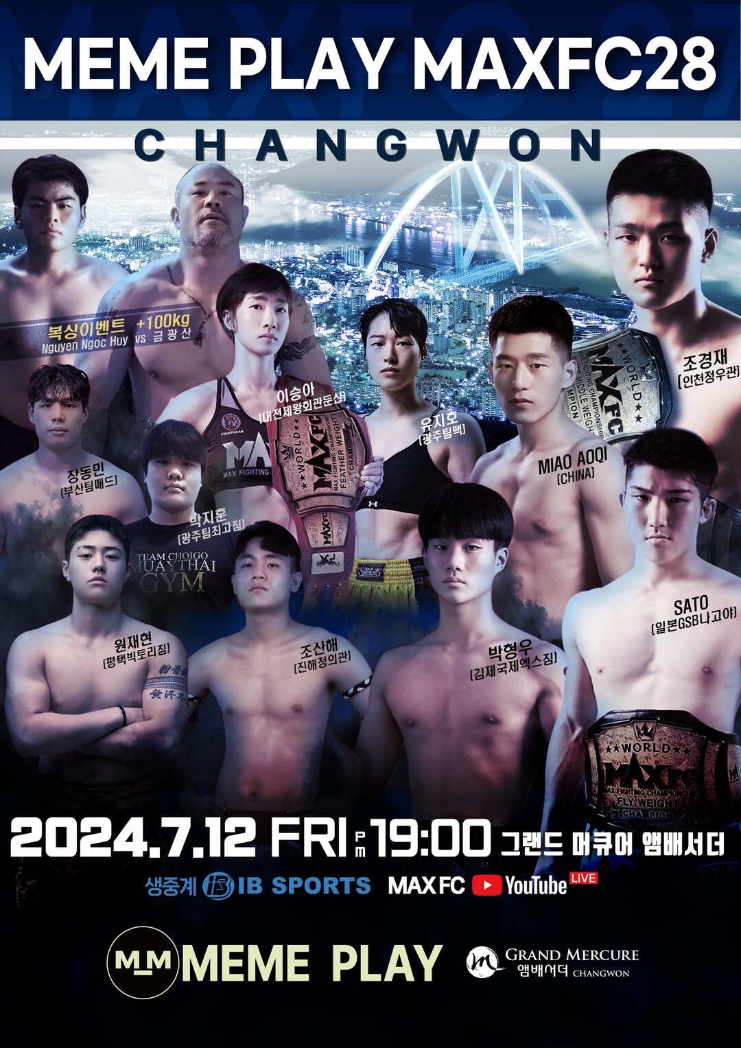이번 ‘밈플레이 MAXFC 28 IN 창원’ 대회는 경상남도 지역에서 열리는 첫 메인 이벤트로 그에 걸맞게 모든 매치가 흥미진진하게 구성되었다. 이번 대회에는 현 MAXFC의 간판 스타 조경재를 필두로, 라이트급 전 챔피언 조산해, 그리고 ‘실전형 액션배우’ 복서 금광산, 밴텀급 신성 박형우, 여성부 최강이라 불리는 현 라이트급 챔피언 이승아, 헤비급 랭킹 1위 장동민 등 현 입식격투계기의 강자들이 대거 출전한다.