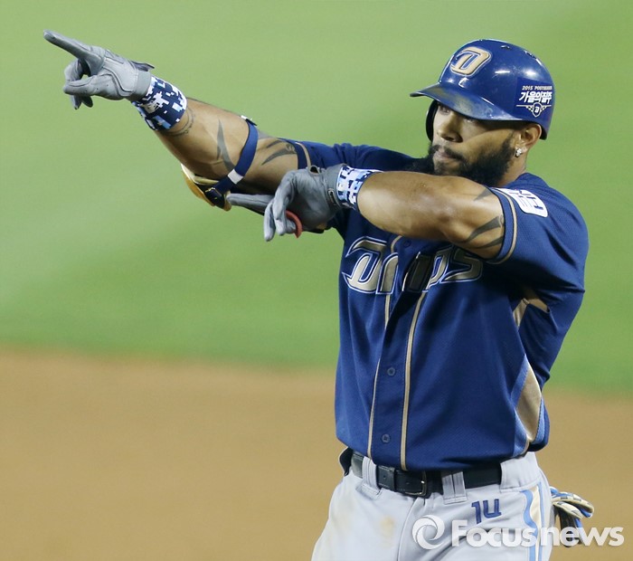 | △ 지난 10월 21일 잠실구장에서 열린 프로야구 2015 포스트시즌 NC-두산 PO 3차전, 3회 1사 1,2루에서 NC 테임즈가 우중간 적시타를 치고 덕아웃을 향해 임무완수의 신호를 보내고 있다. <사진제공=포커스뉴스> |