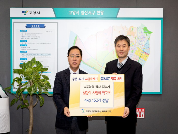 [부자동네타임즈 김인수기자] 고양특례시 일산서구는 지난 5일 송포농협 감사(김승기)로부터 설맞이 떡국떡 4kg 150박스(345만원 상당)를 후원받아 일산서구 관내 취약계층에 지원한다고 밝혔다.